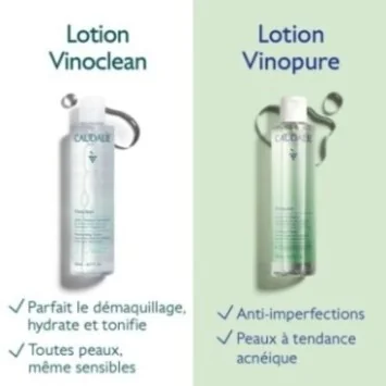 La Lotion Vinoclean, sans alcool, parfait le demaquillage, hydrate et tonifie tous les types de peau. La Lotion Vinopure reduit l'apparence des imperfections des peaux a tendance acneique